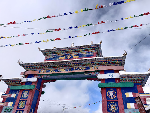 Done with the war memorial, we visited the washroom (the same one which we visited in the dark evening on the way to Tawang). During daytime, we could see the pathway to the washroom. Since the snow was melting, it was slippery and a task to walk down and come back. We drove further and passed by the Sela lake and Sela Pass. We halted at the Tawang gate at 1 PM, to get clicked with Sela Pass landmark and play in the snow.