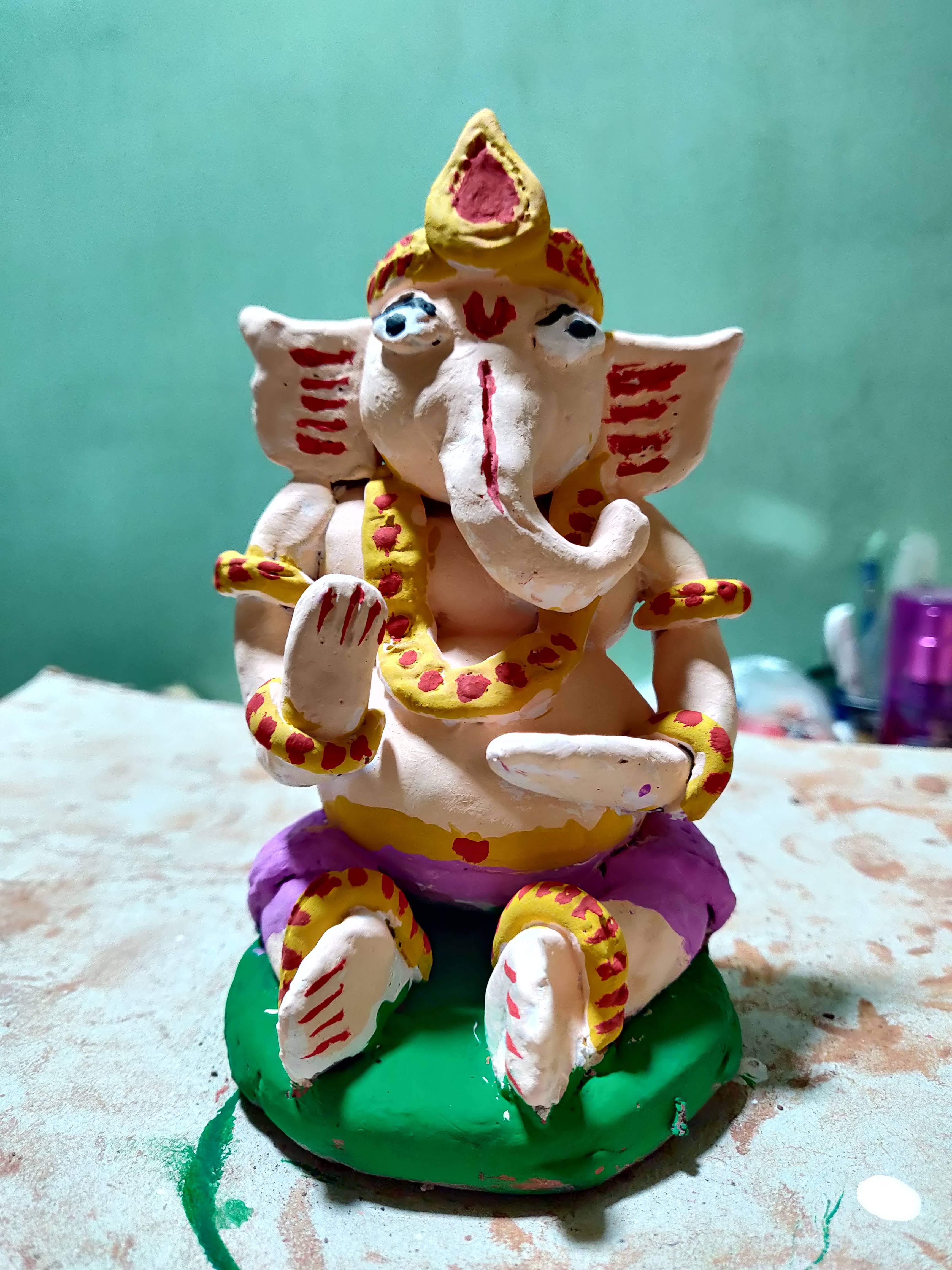 After keeping the idol to dry for a day, I applied colour to it and again kept it to dry for another night. Finally the idol was ready for the puja on Ganesh Chaturthi.